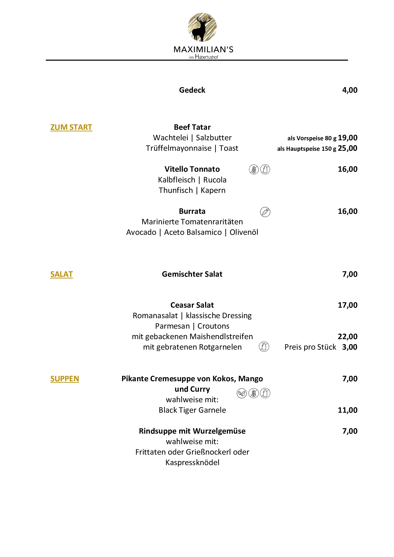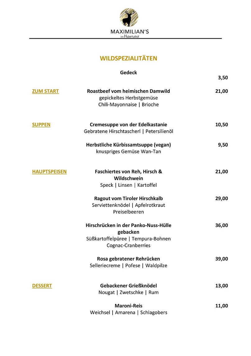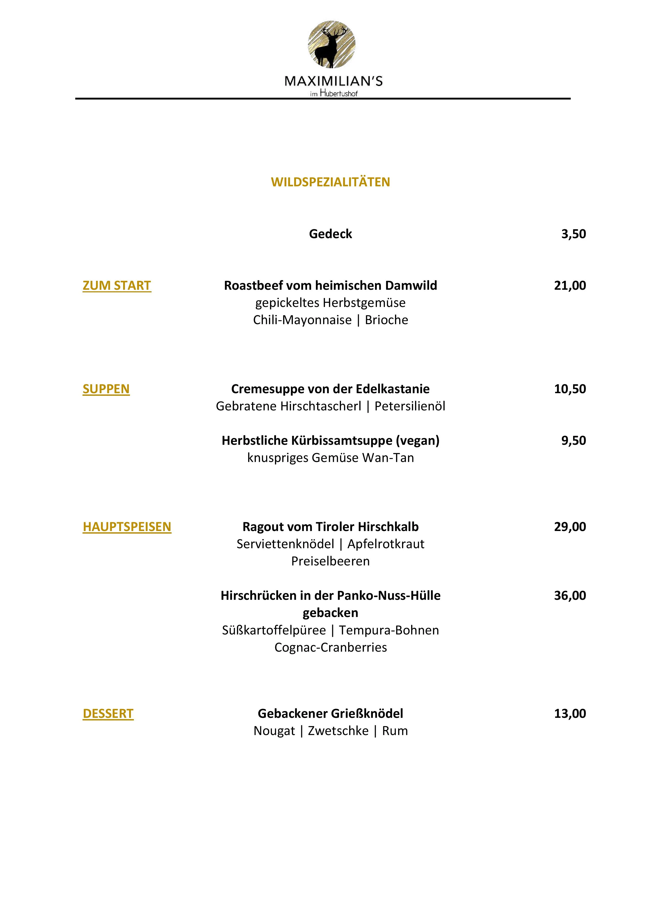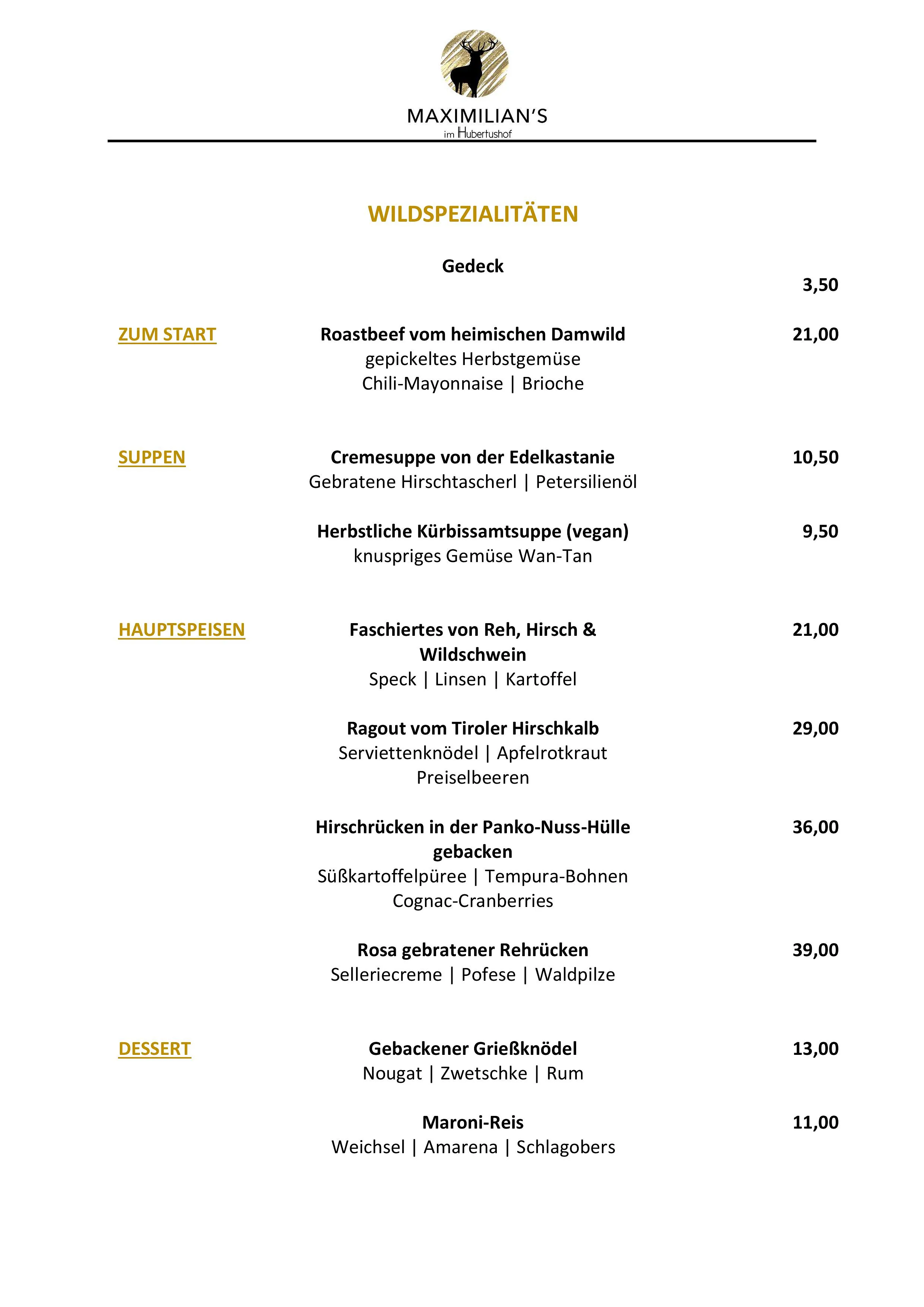 Im Restaurant Maximilian im Hotel Hubertushof werden kulinarische Träume wahr. Wir begeistern unsere Gäste aus Nah und Fern mit hausgemachten Spezialitäten der heimischen Küche und erlesenen Weinen aus der hauseigenen Vinothek. Als Basis für unsere Gerichte dienen regionale Erzeugnisse kontrollierter Hersteller. Die Speisen werden nach traditionellem Rezept zubereitet, fein gewürzt und geschmackvoll angerichtet.